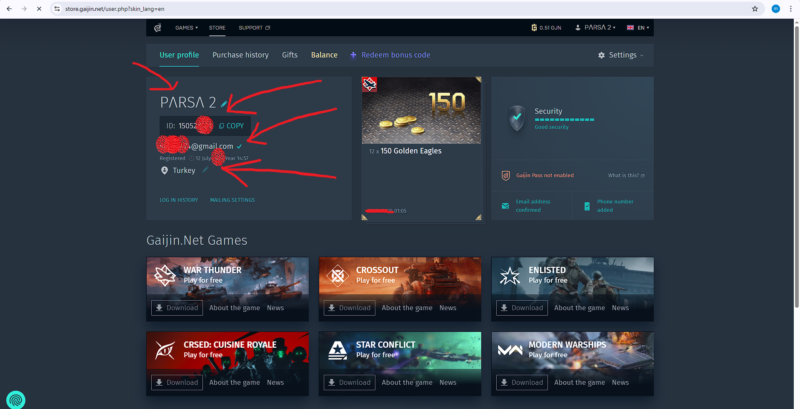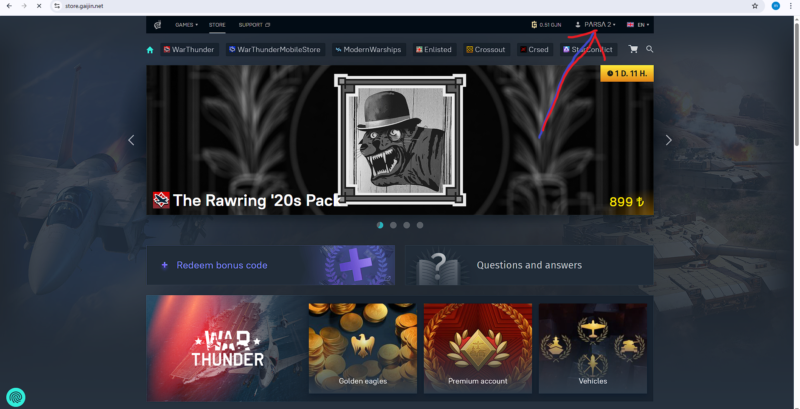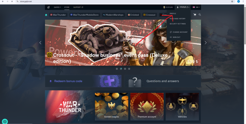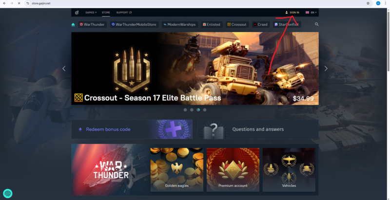 ابتدا وارد سایت گایجین به آدرس https://store.gaijin.net/ شده سپس طبق تصاویر زیر عمل کنید
