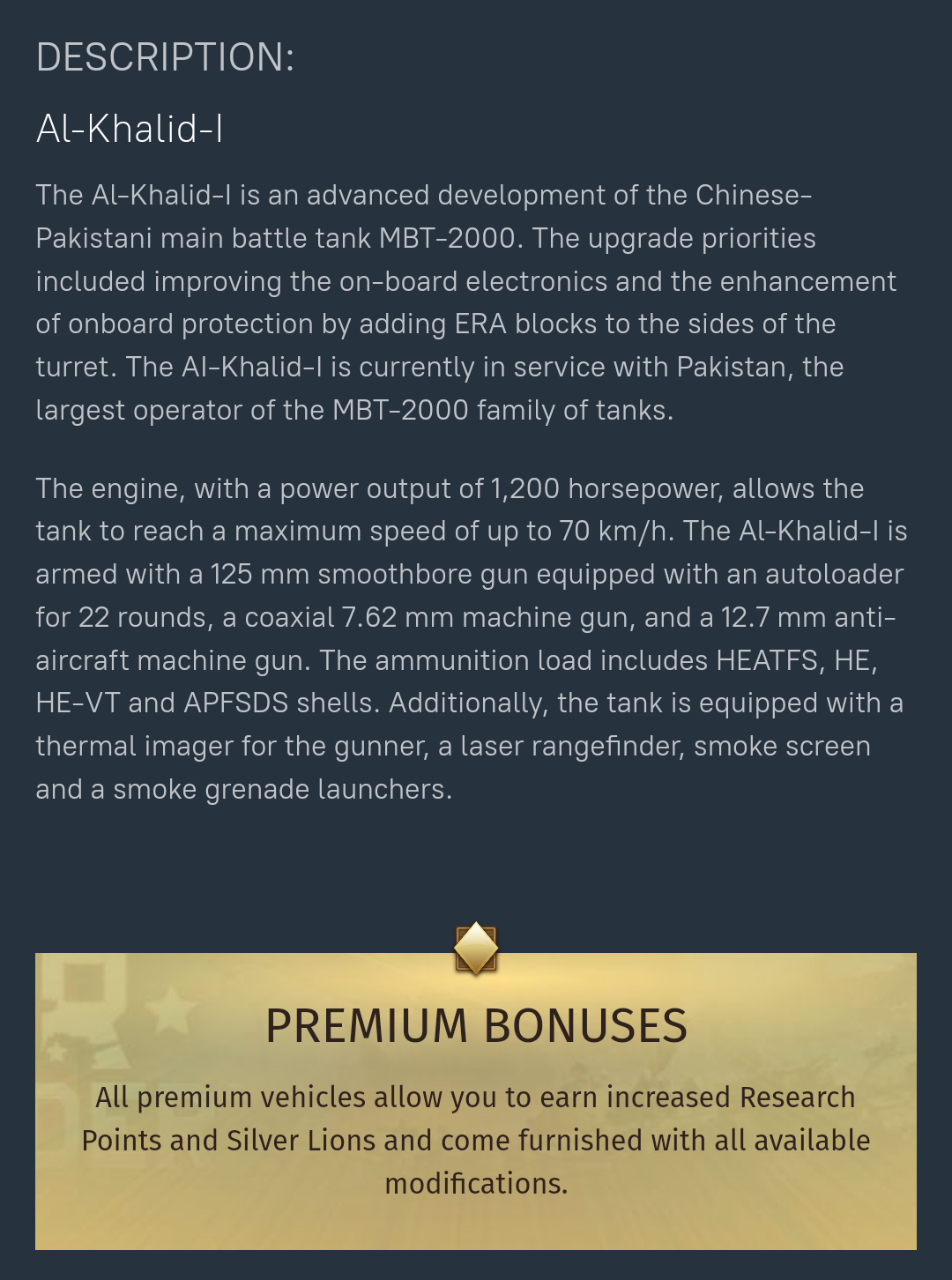 All premium vehicles allow you to earn increased Research Points and Silver Lions and come furnished with all available modifications.